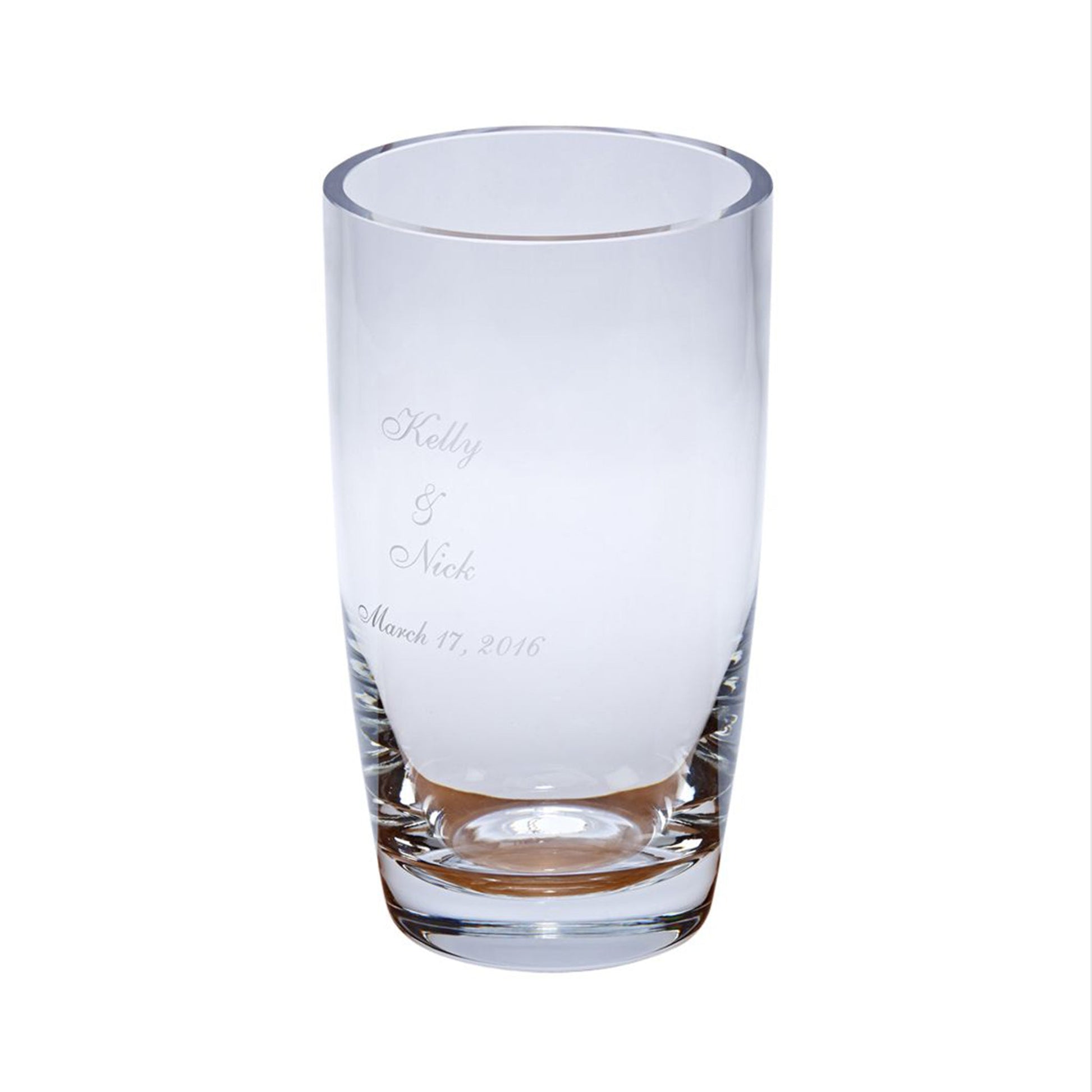 The Simon Crystal Collection uses some of the most popular and useful shapes but does them with a clean, uncut look that some may think is more contemporary than traditionally cut crystal. But Simon offers more that because Simon is all lead-free crystal, alleviating concerns some have about lead in crystal and making Simon suitable for laser engraving as well as sandblasting. This item is a 9.75" tall vase with a 5.5" diameter at the top of the vase. Gift Boxed.
